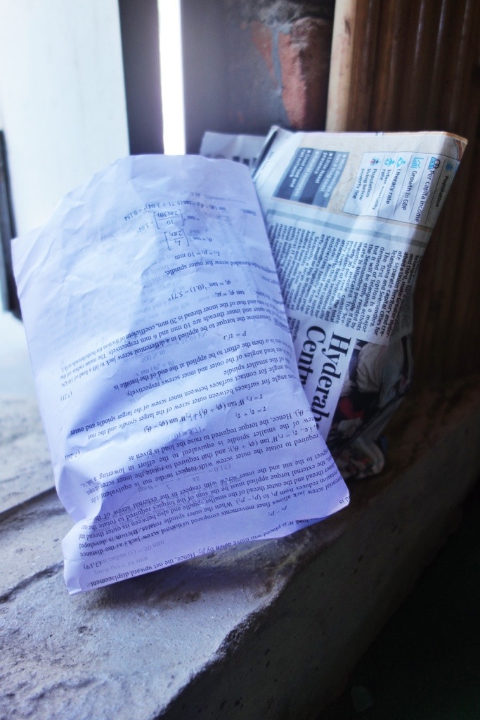 Whenever you buy street food, anything from samosas to bananas, they put it in these homemade bags which save money as well as trees. This one here use to be someone’s math homework, while the one behind is an old newspaper article. Simple yet effective.